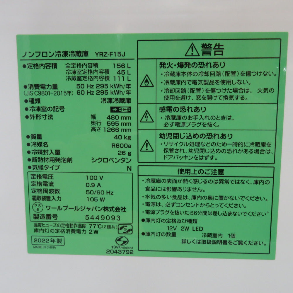 ヤマダ電機 ヤマダデンキ 冷蔵庫 ヤマダオリジナル 156L 2ドア YRZ-F15J ホワイト 2022年製 一人暮らし 洗浄・除菌済み